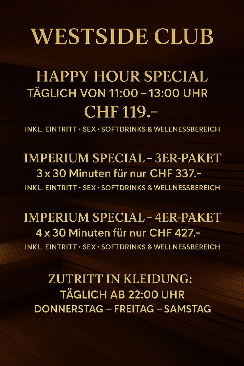 Westlich von Frauenfeld (TG) findest du die schönste Erholungsoase der Ostschweiz. Der Club Westside ist bekannt als der FKK Club mit dem schönsten Aussenbereich. Die grosszügige Aussenanlage bietet mit dem einzigartigen Garten, dem grossen Swimmingpool, den bequemen Liegen und Liebeslauben ein Paradies für Erwachsene. Im Innenbereich verfügt der Erotikclub über eine grosse runde Bar, ein Sexkino, einen modernen Duschbereich und einen Wellnessbereich mit Sauna, Whirlpool sowie verschiedene Bereiche und Zimmer als private Rückzugsmöglichkeit mit deiner Favoritin.